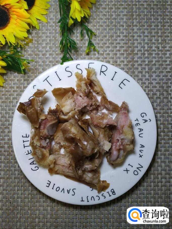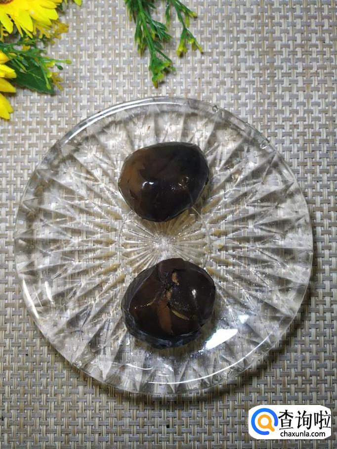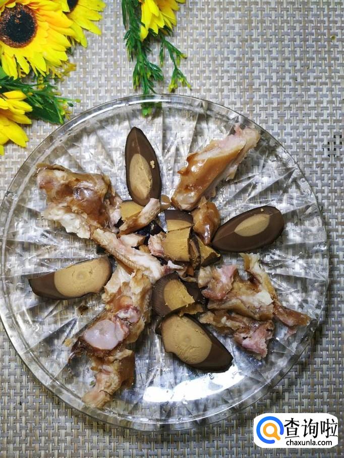 准备适量猪蹄,用刀剁开,这样吃的时候会更加方便一些,再准备两个卤蛋,用刀切开,如图所示,摆一下。