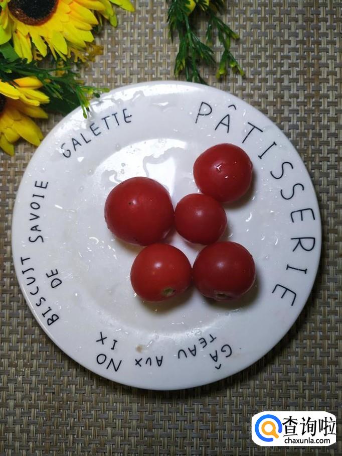 再准备适量圣女果,用清水洗净后,对半切开,放入盘中。