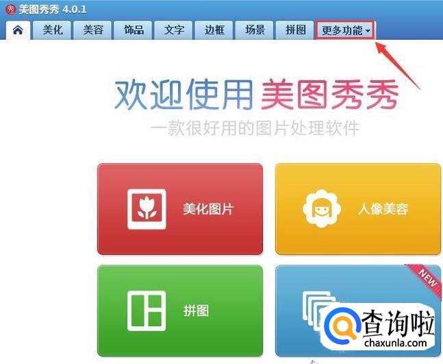 我们双击美图秀秀的快捷图标将该软件打开,在打开的界面内找到更多功能选项,如图所示: