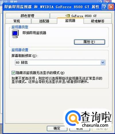 上面这种情况还可以看一下显示器的刷新率是否正常,方法是在桌面空白处右键单击点“属性”,在设置选项里点“高级”。