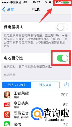 打开电池选项页面后找到“电池百分比”,点击开启,右上角就会显示出百分比的状态了,如图。