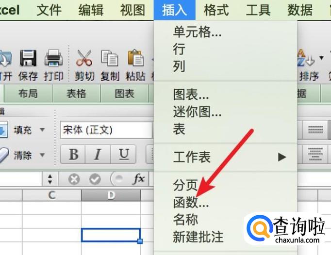 打开Excel,点击菜单栏上的‘插入’-->‘函数’