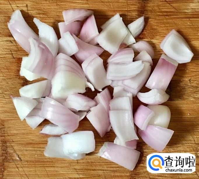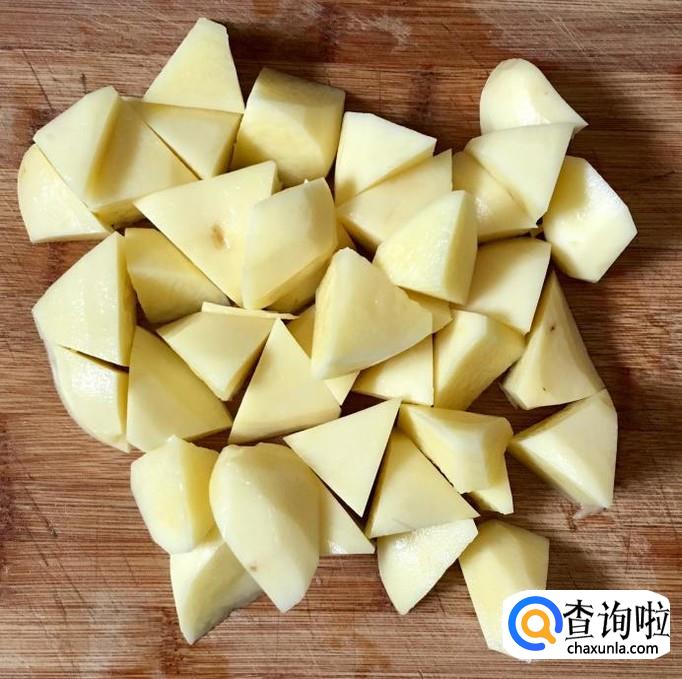 土豆清洗干净泥沙削去外皮切成大小均匀的滚刀块,洋葱一个剥去外皮切掉两端后切成块状备用。