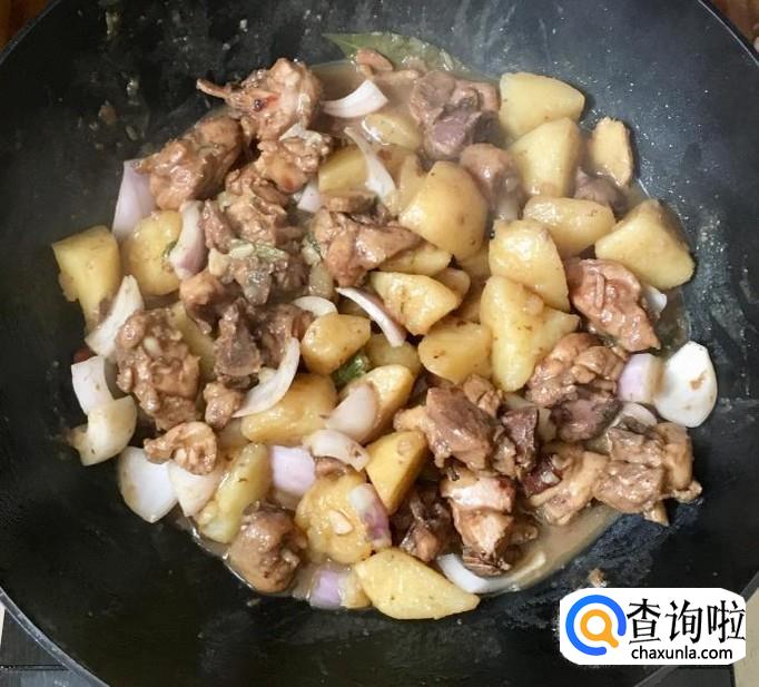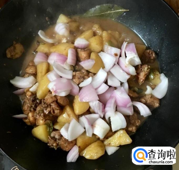 锅中还有三分之一汤汁并且食材熟透后放入洋葱块搅拌均匀再烧3分钟左右即可关火
