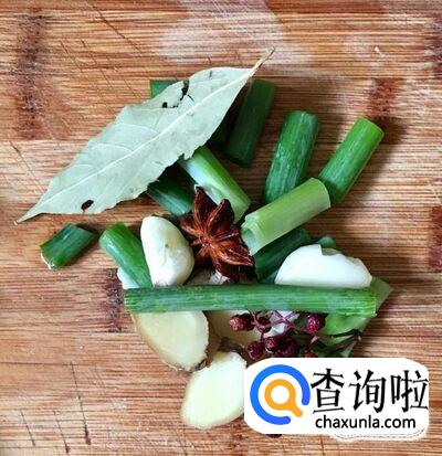 葱、姜、蒜剥去外皮清洗干净分别切成葱段、姜片、大蒜拍扁,茴香梗、八角、花椒、香叶冲洗干净备用
