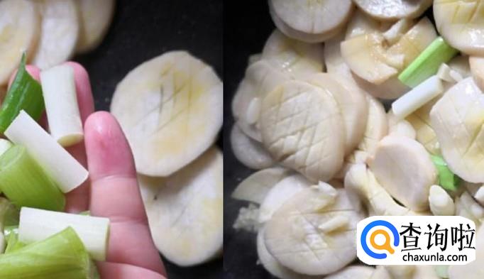 锅内倒油,放入杏鲍菇煸炒,然后加入葱段一起煸炒出香。