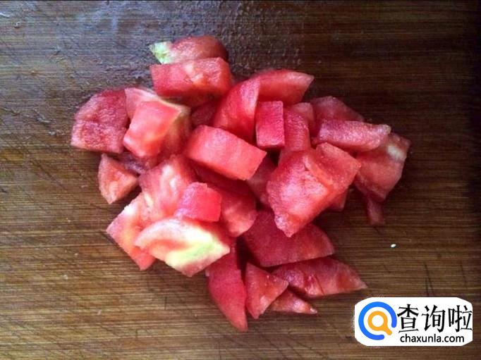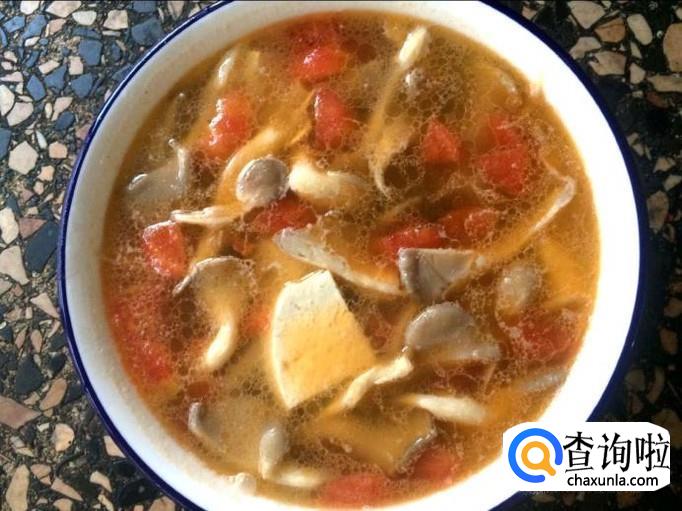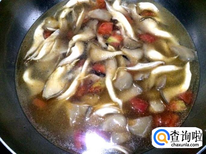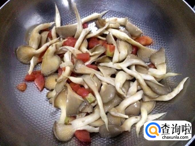 起锅烧热,下猪油,油化后下西红柿、蘑菇翻炒均匀。