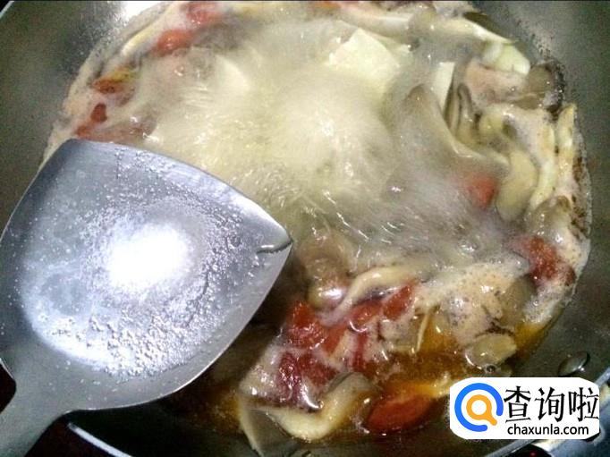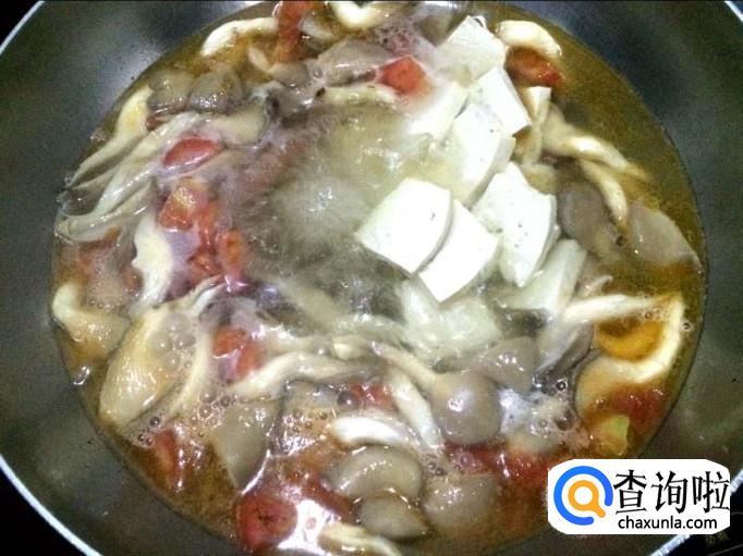 加适量清水炖煮至水沸后,加入豆腐小火炖煮十分钟。