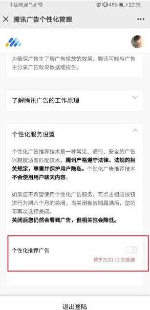 6、进去腾讯广告个性化管理之后,点击关闭个性化推荐广告,就关闭了监听模式,关闭之后,微信就不会再根据我们浏览的内容,发布的朋友圈动态,购物转账等来进行个性化推荐广告了。
