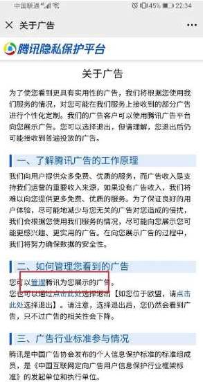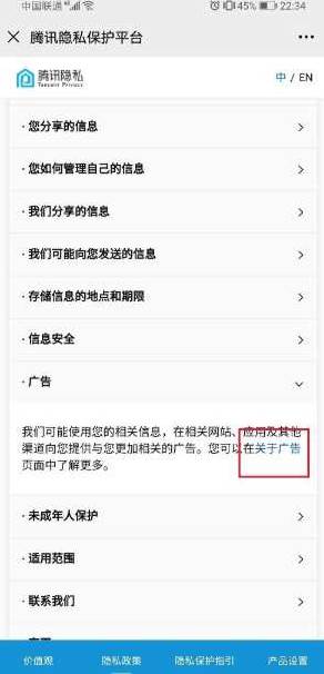 4、进去腾讯隐私保护平台之后,点击广告下方的关于广告;