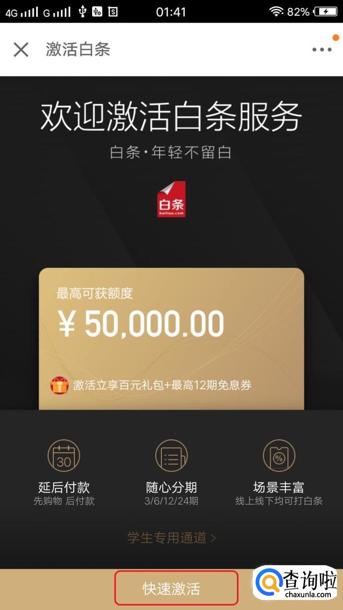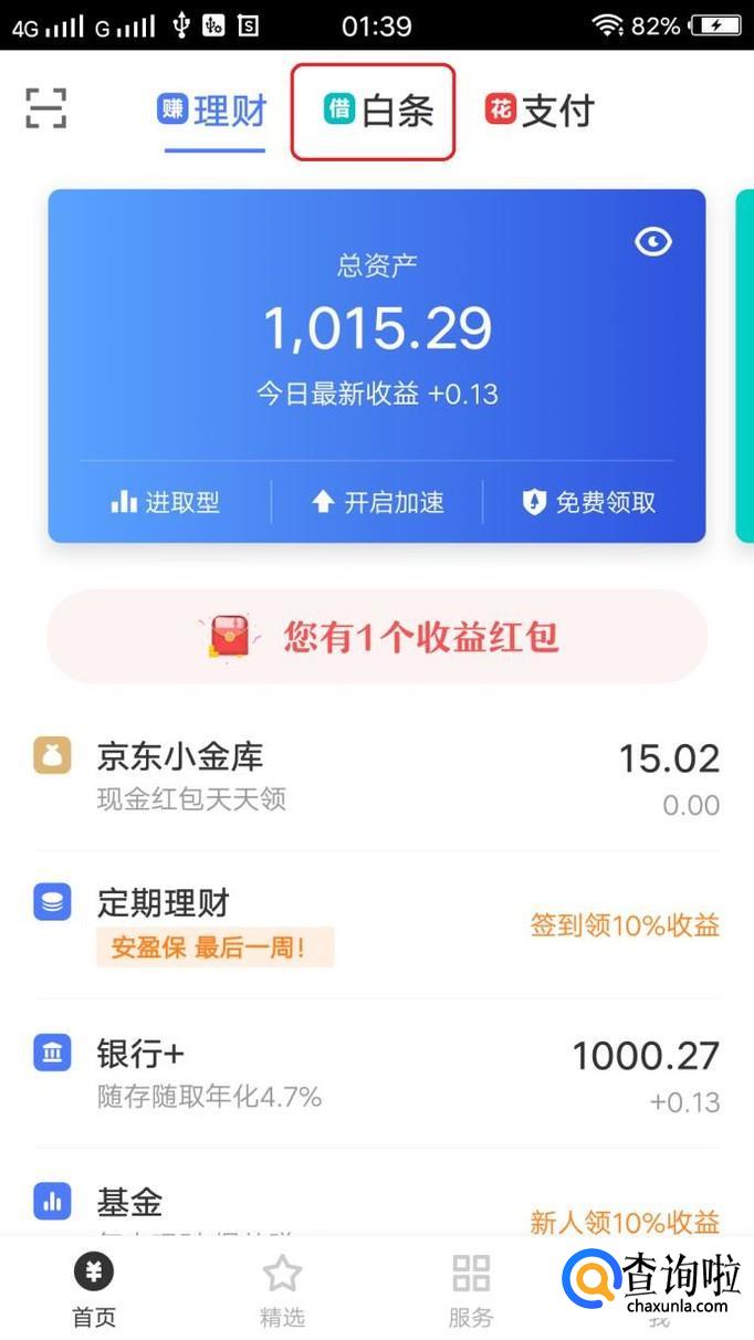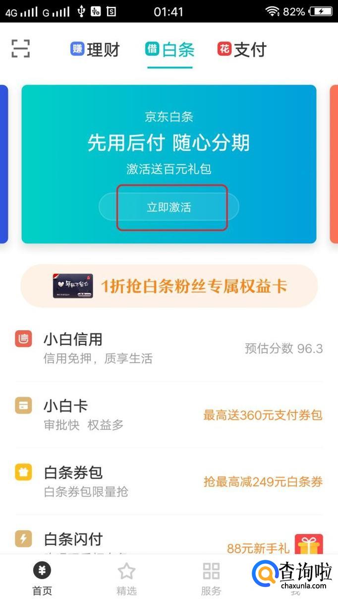 打开该app,我们在首页就可以在顶部醒目位置看到“白条”,点击一下。