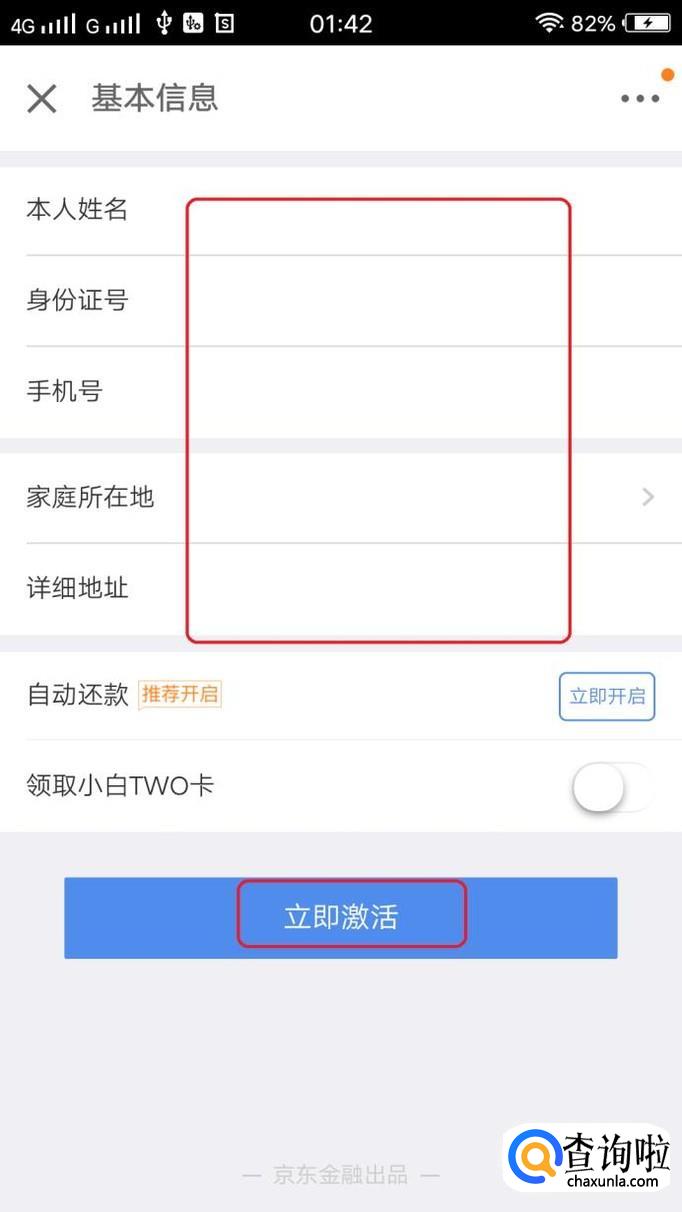 如图所示,把该页面内的信息都填完之后,下方“立即激活”按钮就变成蓝色的,点击就可以激活白条了。