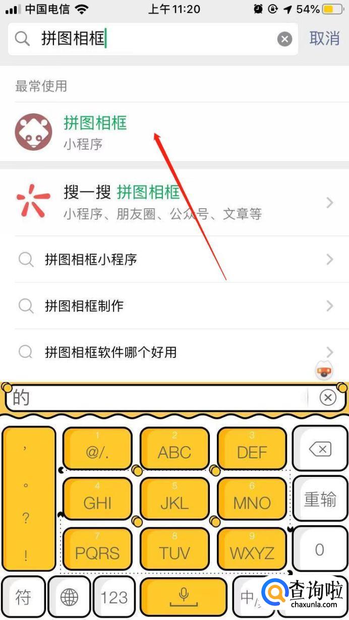 首先,我们打开手机微信,然后在微信的搜索框里面搜索“拼图相框”,在搜索出来的结果里面点击并进入该小程序。