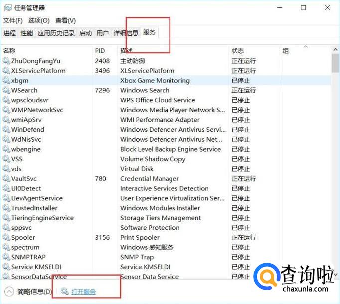 打开任务管理页面之后,点击页面顶部“服务”选项卡,然后点击页面底部“打开服务”选项。