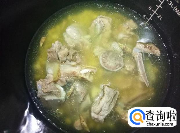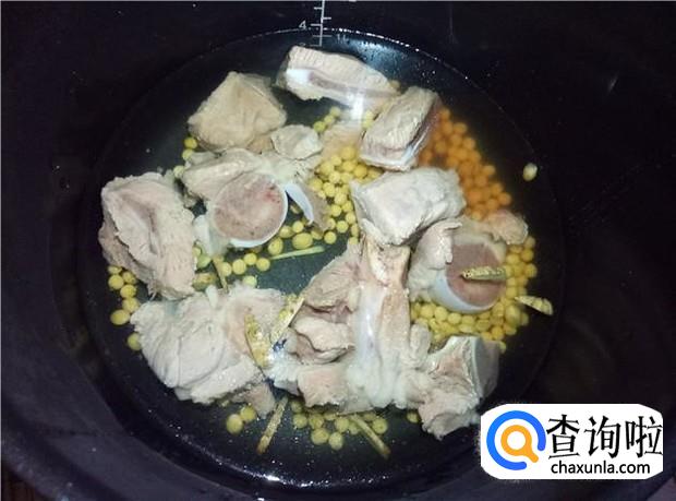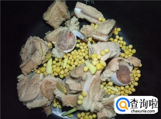 把黄豆、骨头、姜一起放入高压锅中,加入适量的水,开始煮汤。