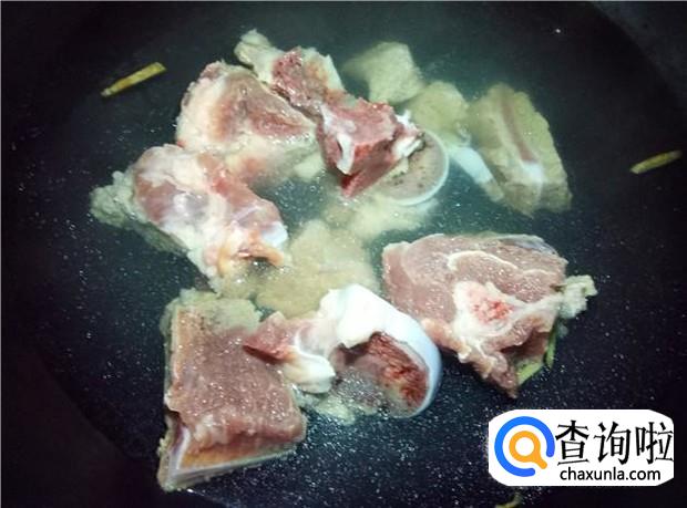 锅里放入半锅水,加入少许姜片,把水煮开。然后倒入大骨头烫几分钟,去掉血水。