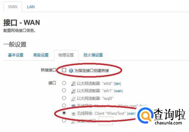 (2) “接口” 内的各项仅选择“无线网络: Client xxxx”(xxxx代表上级WiFi的SSID)。