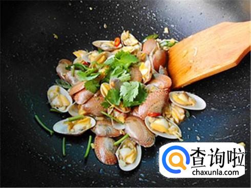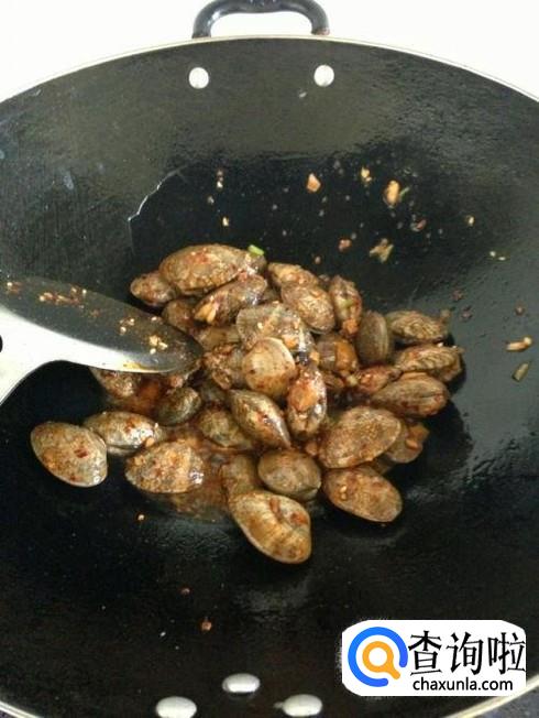 锅里加一点点油烧热,下入葱姜蒜爆锅,将花蛤放进去翻炒,这个时候一定要用猛火炒,这样炒出来的花蛤味道特别鲜美。
