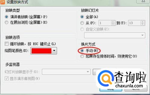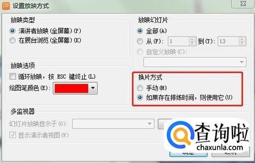 可以看到弹出来的小方框右手边有“换片方式”,刚开始是“如果存在排练时间则使用它”