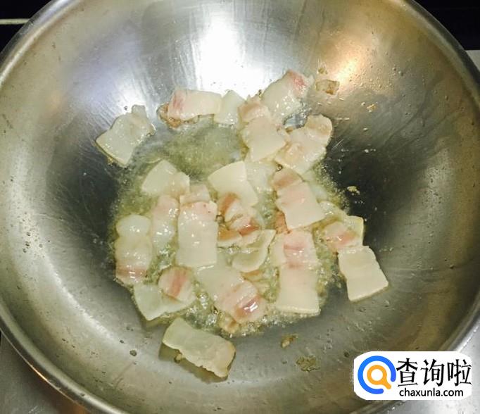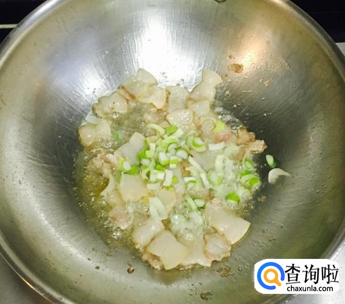 热锅加油把五花肉片炒出香味,放入葱花爆香