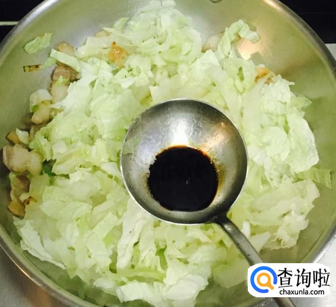 放入切好的大白菜条加入适量的生抽翻炒均匀至白菜上色变软