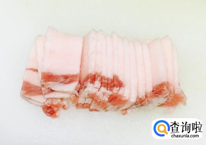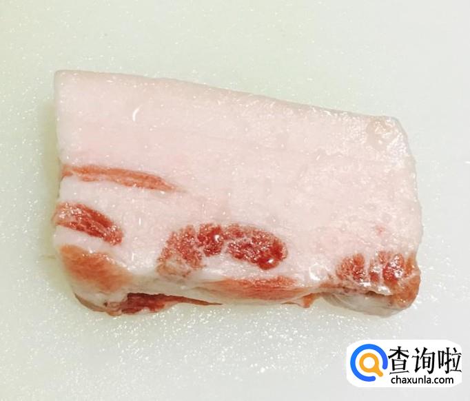 五花肉一块儿用水冲洗一下切成五花肉片备用