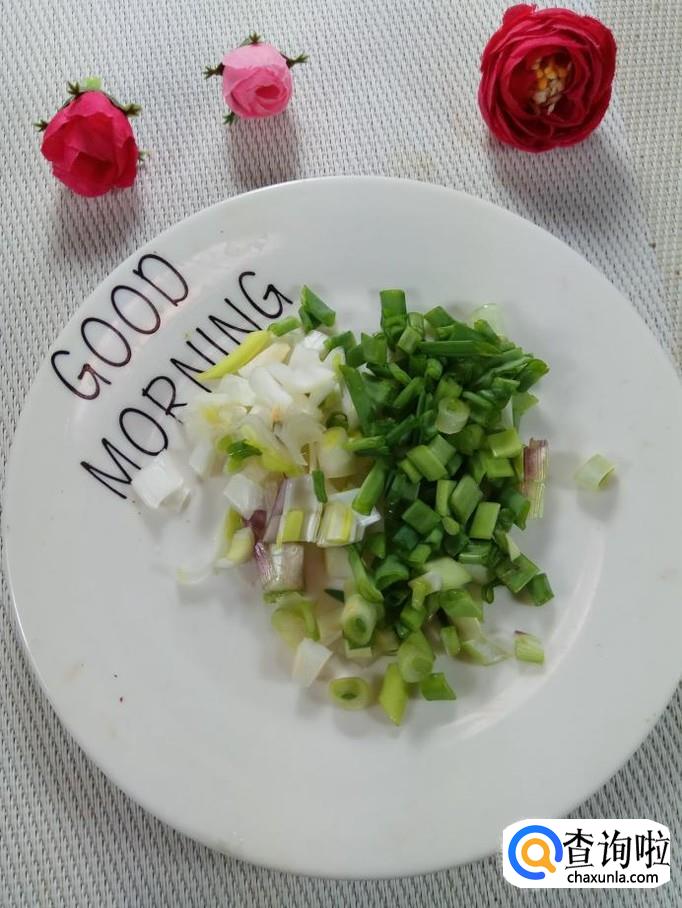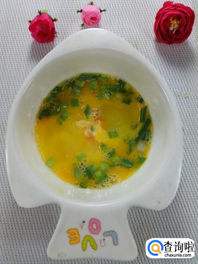 碗中打入一个鸡蛋,再准备适量蒜苗,切碎放入鸡蛋液,打散备用。
