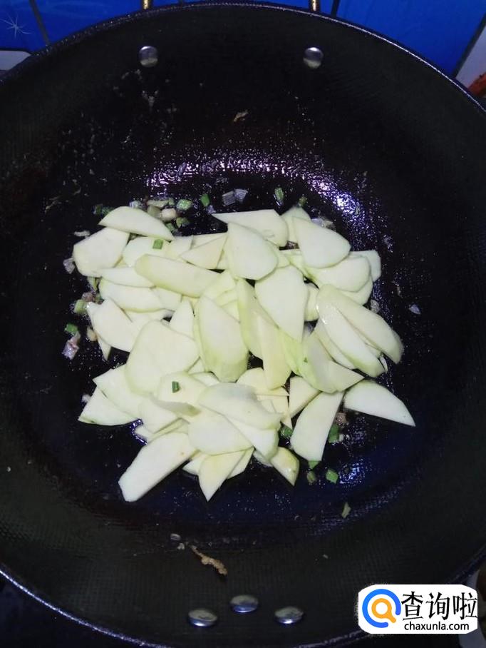 锅中再加入少许油,将小葱放入锅中炒香,然后将南瓜片倒入锅中,翻炒均匀。