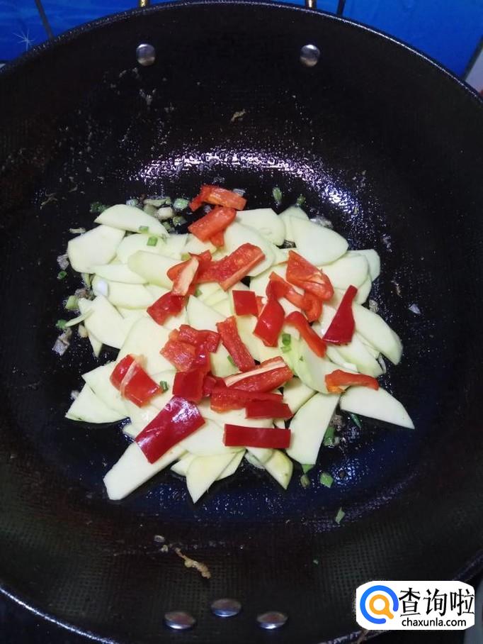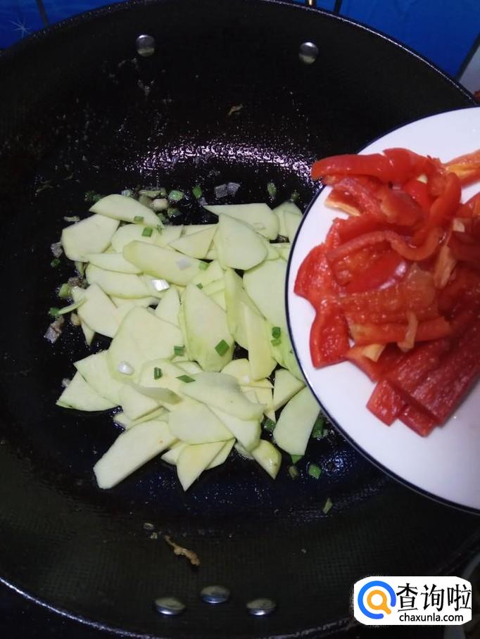 将准备好的红椒丁儿倒入锅中,和南瓜片一起翻炒均匀。