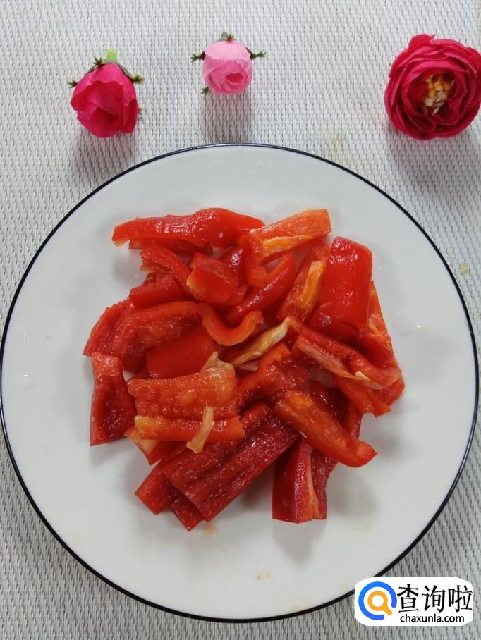 准备适量红椒,洗净后切成丁,放入盘中备用。