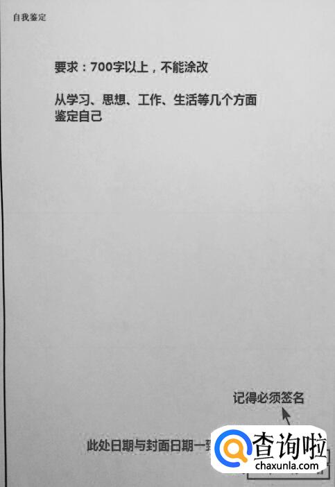 自我鉴定栏用黑色墨迹签字笔手写,可以从学习、思想、生活、经历等方面阐述,字数为800字左右,不得随意涂改。