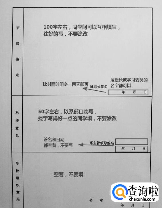 最后一页中的班级鉴定和系部意见不用自己写,可以让同学帮忙交换写,字数在100字左右,最后学校组织意见一栏空着,由学校填写。