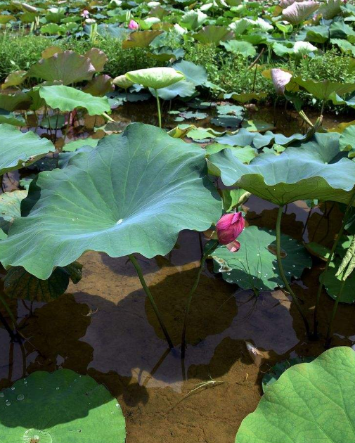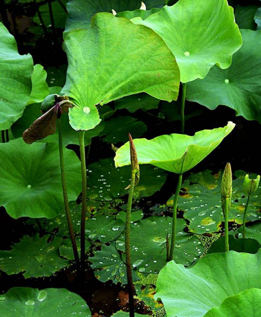 它们像一个个弹力十足的“空气垫”,当水滴滴落在荷叶上时,因为弹力的作用,水滴便像胶球般无法安稳地待在叶面上,只能在各个如小山包般的突起上滚来滚去。最后,在表面张力的作用下,带着叶面的灰尘、淤泥、细菌等各种微粒滚落到池塘里,这就是荷叶千百年来“出淤泥而不染”的根本原因。