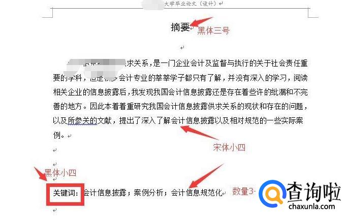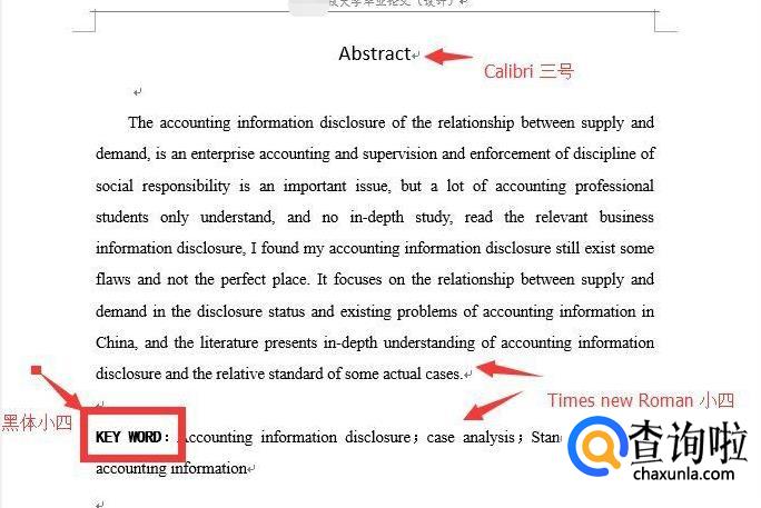 论文摘要和关键词。中文摘要及关键词。另起一节。标题为“摘要”,3号黑体。段前为两行,段后为一行,居中独占行,单倍行距。内容用小4号宋体,首行缩进2字符,行距为22磅固定值。“关键词”三字用4号黑体,后接冒号,内容用小4号黑体;关键词通常不超过7个,词间空一格,不加标点。英文摘要及关键词。另起一节。英文摘要的标题为“ABSTRACT”,3号Calibri粗体。段前为两行,段后为一行,居中独占行,单倍行距。英文摘要的内容格式为:小4号TimesNewRoman字体,首行缩进2字符,行距为22磅固定值,不采用悬挂格式。每个英文标点符号后,都要加一个空格。英文关键词“Keywords”为4号TimesNewRoman加粗,后接冒号,内容用小4号TimesNewRoman,上空一行,居左独占行;不同的关键词之间加英文的分号“;”。