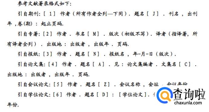 参考文献类型格式。中文论文 编号.作者名(译著的外国作者在姓名前用方括号括住的国籍简称,多个作者之间加顿号,亦可略写为“××等”),“文章题目”,《期刊名》,年份,卷号,期数。中文著作 编号.作者名,译者名,《书名》,出版单位,年份和版次。网上参考资料 编号.作者名,“文章题目”,http:网站名,发布的年月日。外文论文 编号.作者名(英文名字在前,姓在后,中间是教名,可以缩写),“文章题目”,期刊名(使用斜体,不用书名号),年份,卷号,期数。外文著作 编号.作者(姓名的排序可同论文,但亦可先排姓,加“,”再排名),书名(使用斜体,不用书名号),地名:出版单位,年份.非英语类外文,一律按该国文字格式处理。