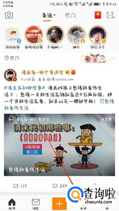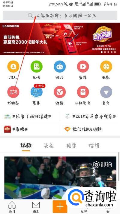 打开微博后,主页面如下。在右下角有发现,安箭头所示打开发现。