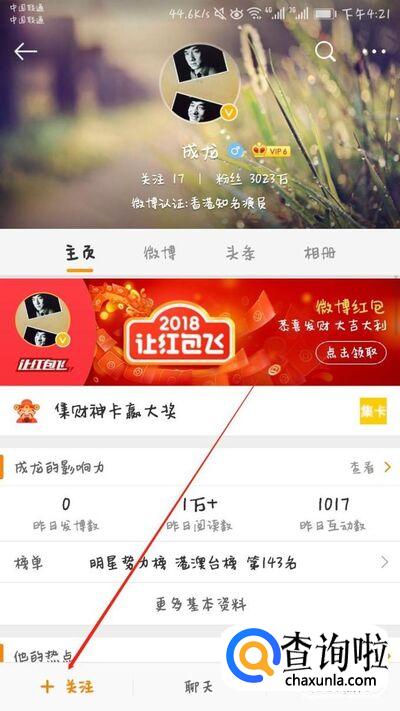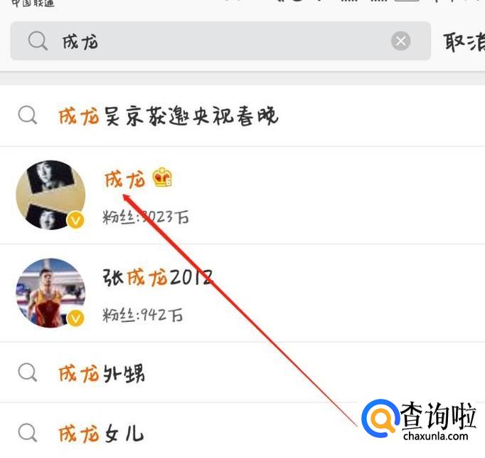 进入发现页面,在最上一栏搜索您想关注的人。如成龙。