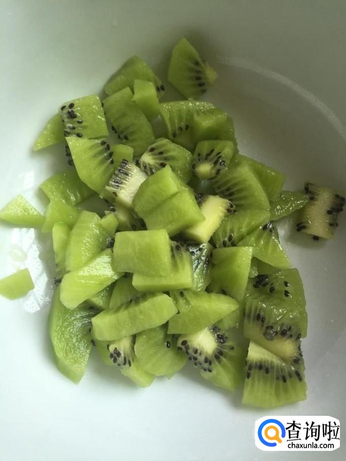 接下来我们需要把猕猴桃去皮,用勺子把猕猴桃完整取出,把猕猴桃果肉切成扇形。