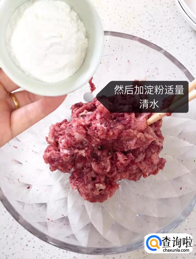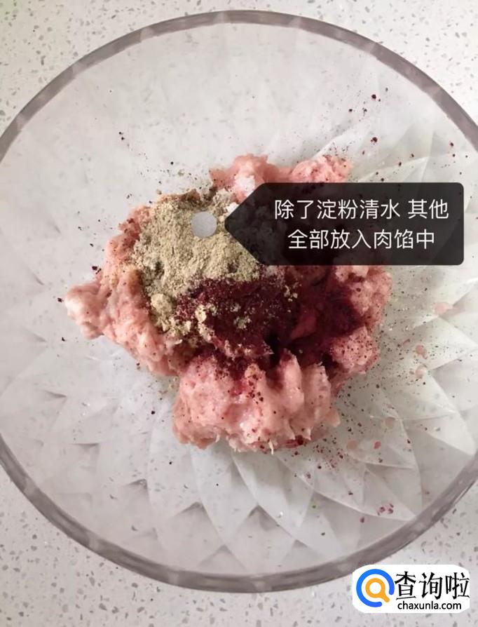 接着把除了淀粉和清水以外的其他全部食材放入肉馅中,如下图所示。