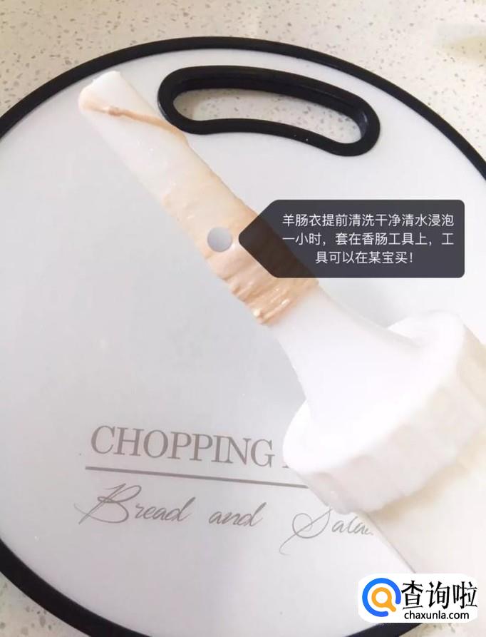 接着把肠衣清洗干净,套进香肠器,如下图所示。