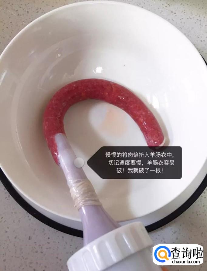 然后把肉馅打进肠衣,如下图所示。