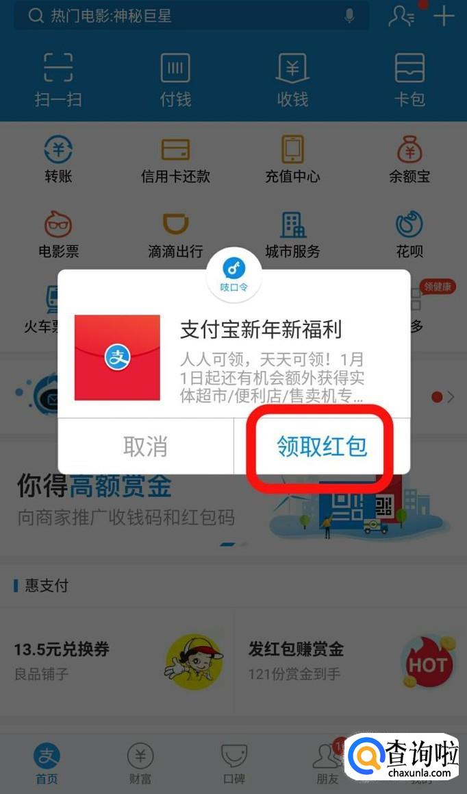 如果是领取朋友的分享红包,首先需要扫描朋友分享红包的二维码或者是复制朋友分享红包的链接,然后打开支付宝,会出现一个领取红包的指示。