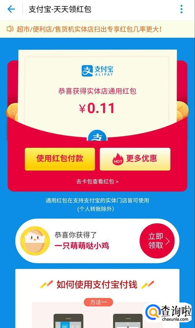 点击领取红包以后,就可以看到自己得了多少红包啦!这个红包可以用于实体店支付时使用哦。使用期限在3天。