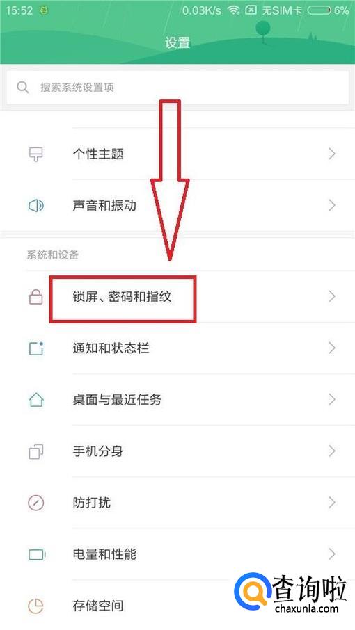 首先打开手机上的“设置”按钮,选择“锁屏、密码和指纹”选项。