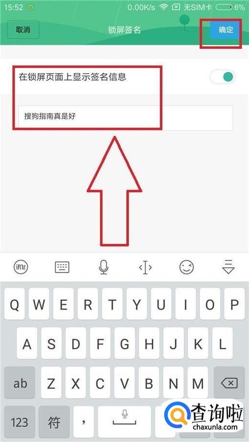 在这里输入我们想要设置的内容,然后点击右上角的“确定”按钮,即可设置锁屏文字。
