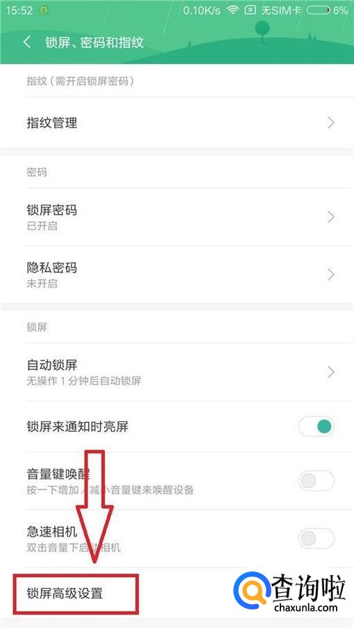 然后我们下拉到最底部,会看到有一个“锁屏高级设置”的选项。