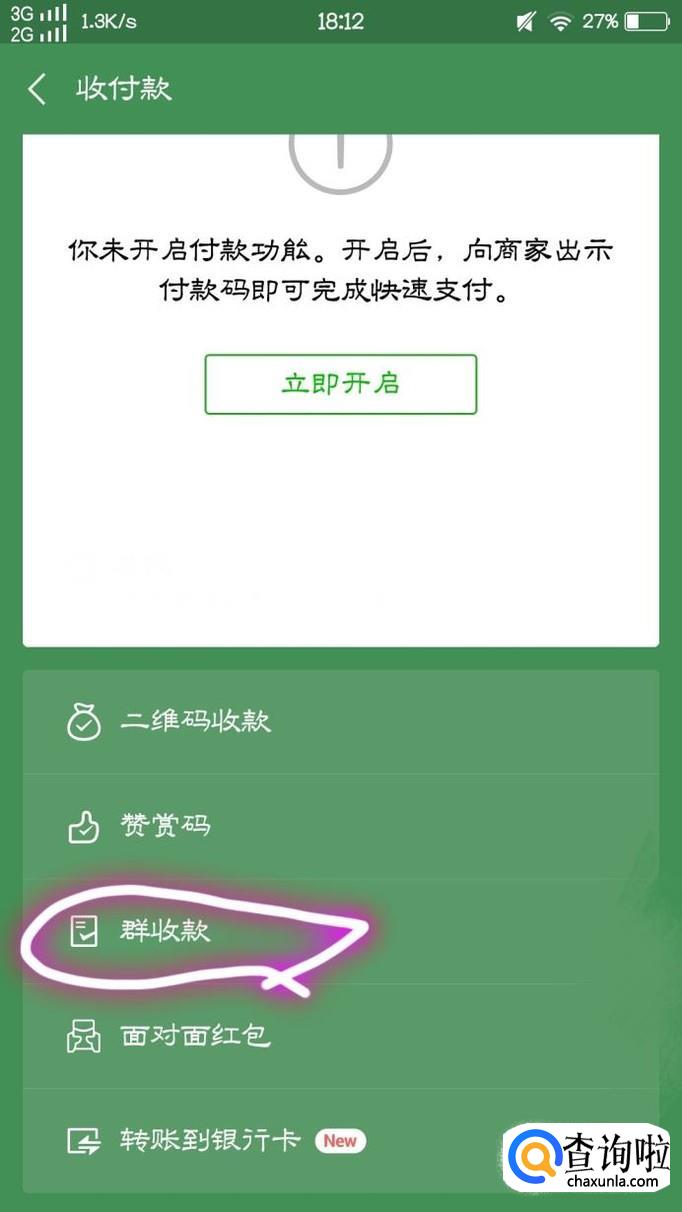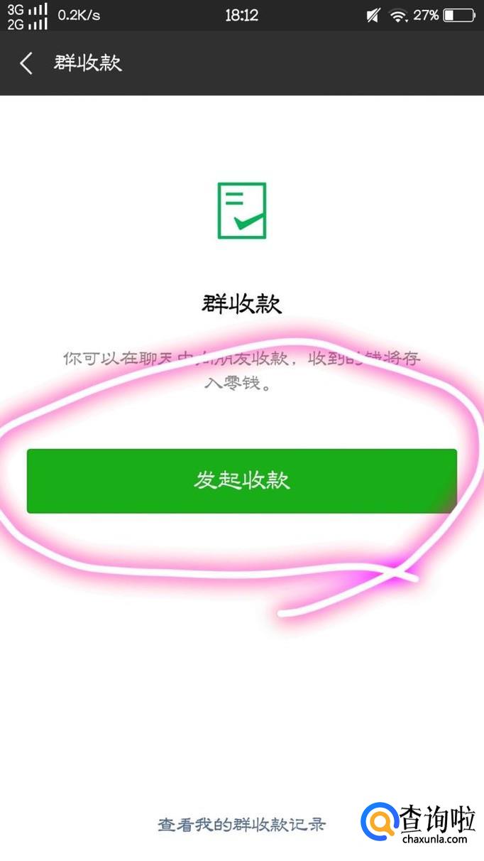 最后,我们完成上一操作后,我们滑至屏幕下方的“群收款”,完成上一操作后,点击“发起收款”即可