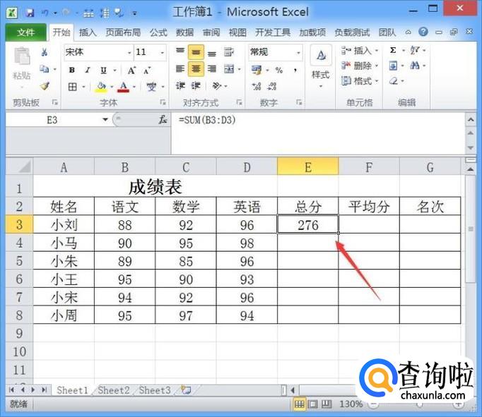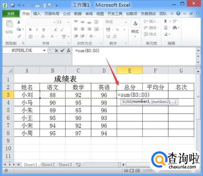 我们在总分处选择第一个单元格输入我们的函数,并在函数里输入参数,如图所示: