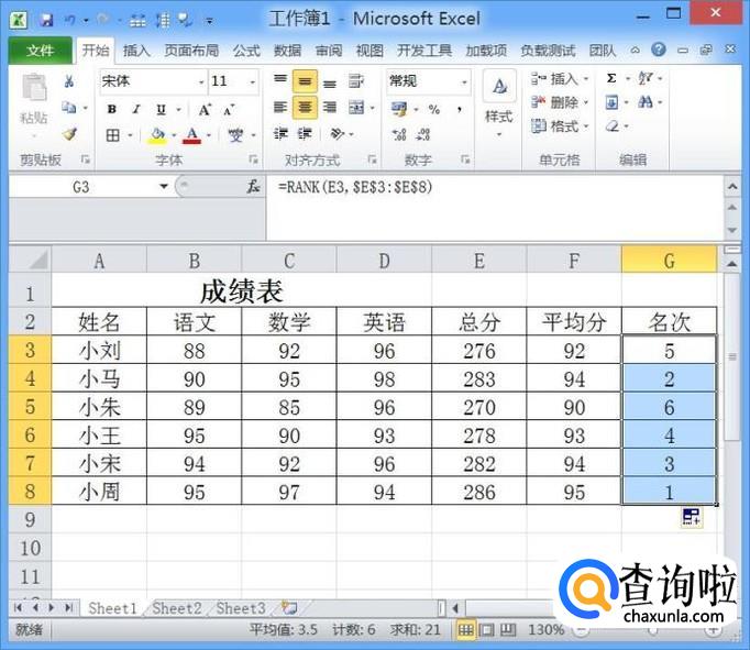 将鼠标左键移到该单元格的右下角然后拖动鼠标左键就将所有人的排名统计出来了,如图所示: