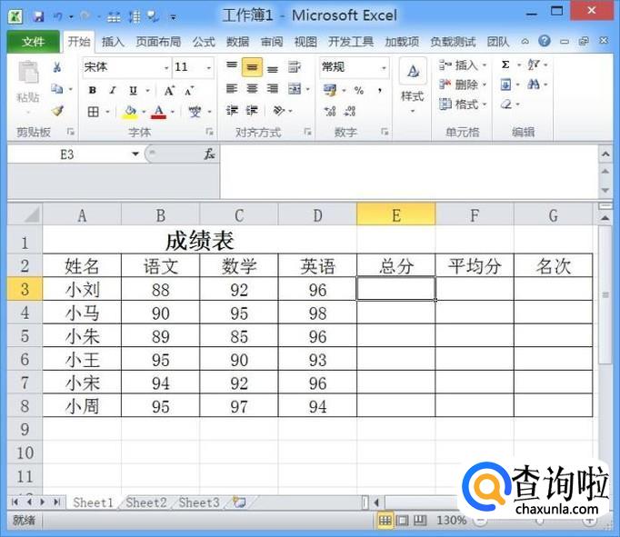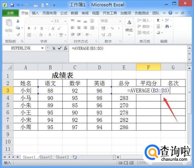将鼠标左键放到该单元格的右下角,然后拖动鼠标左键这样所有人的总分就计算出来了,再选择平均值里的单元格,然后输入函数,并在函数里输入参数,如图所示: